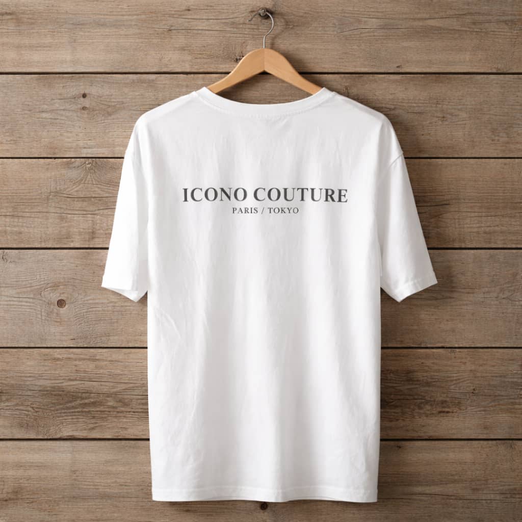 A clean white tee featuring a subtle ICONO COUTURE Paris/Tokyo chest logo and a bold statement print across the back, designed for the modern man who embodies quiet confidence and refined minimalism. Crafted for effortless versatility, it pairs perfectly with tailored trousers and sneakers for a sharp urban look, or with denim, cargos, and an overshirt for a relaxed fit. Ideal for the man who values understated luxury and lets simplicity define his style.