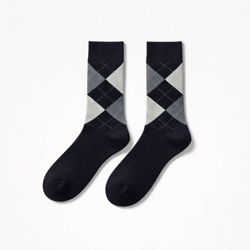 Designed for the modern man who appreciates classic style with a refined edge, these argyle socks deliver a polished finish to everyday looks. They feature a charcoal grey base with blue and white diamond patterns and a contrasting dark cuff. Ideal for office wear, business-casual outfits, or smart weekend dressing, they offer comfort in all seasons. Pair with tailored trousers, chinos, and leather shoes for a clean, coordinated look.