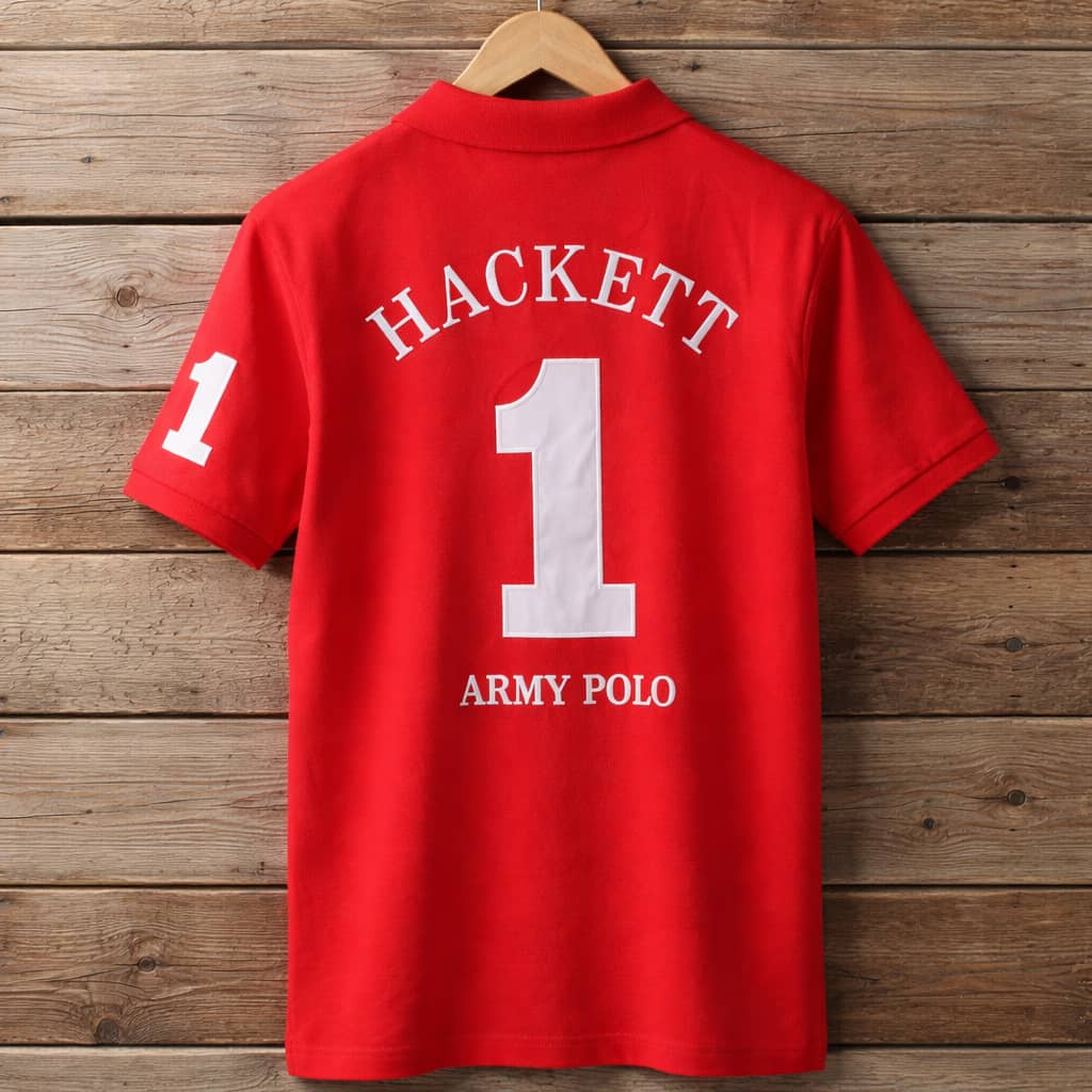 Designed for confident men who appreciate a sporty yet refined style, this red Hackett polo features signature branding, an embroidered crest, and a bold white “1” on the front. The back carries a large “1” with “Hackett” above and “Army Polo” below, creating a strong athletic statement.