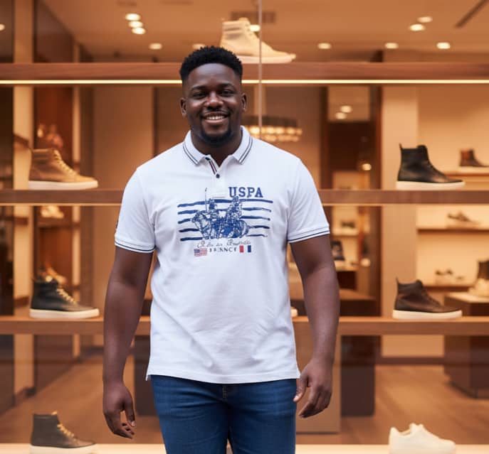A clean and stylish white polo shirt featuring a bold heritage-inspired graphic design by USPA. With its striped collar details, classic button placket, and sporty polo-themed print, this shirt blends timeless elegance with modern casual appeal—perfect for everyday wear or smart-casual occasions.